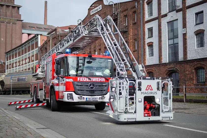 Sie war die erste ihrer Art: die DLAK 23-12 vom Typ M32L-AS. Sie ist die erste Drehleiter mit Knickgelenk bei der Feuerwehr Bremen und fährt als 1/33-1 auf der Feuer- und Rettungswache 1. Magirus baute die Drehleiter auf dem Fahrgestell Mercedes-Benz Econic 1835, 4x2, auf. Der Ulmer Fahrzeughersteller setzte auf die Single Extension Technologie. Das heißt: Nicht alle vier Leiterteile werden gleichzeitig ausgezogen, sondern zuerst das oberste Leiterteil einzeln und danach alle andern. Ab einer gewissen Auszugslänge kann das Gelenk dann abgeknickt werden. Wie bereits die Vorgängermodelle, besitzt auch diese Drehleiter eine Hinterachszusatzlenkung.