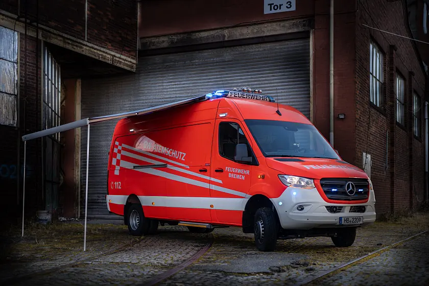 Rückt von der Feuer- und Rettungswache 1 aus: der Gerätewagen Atemschutz, ein Mercedes Sprinter 519 CDI 4x4. In der Regel fahren die Atemschutzgerätewart:innen aus den Wachabteilungen mit dem GW-A raus.